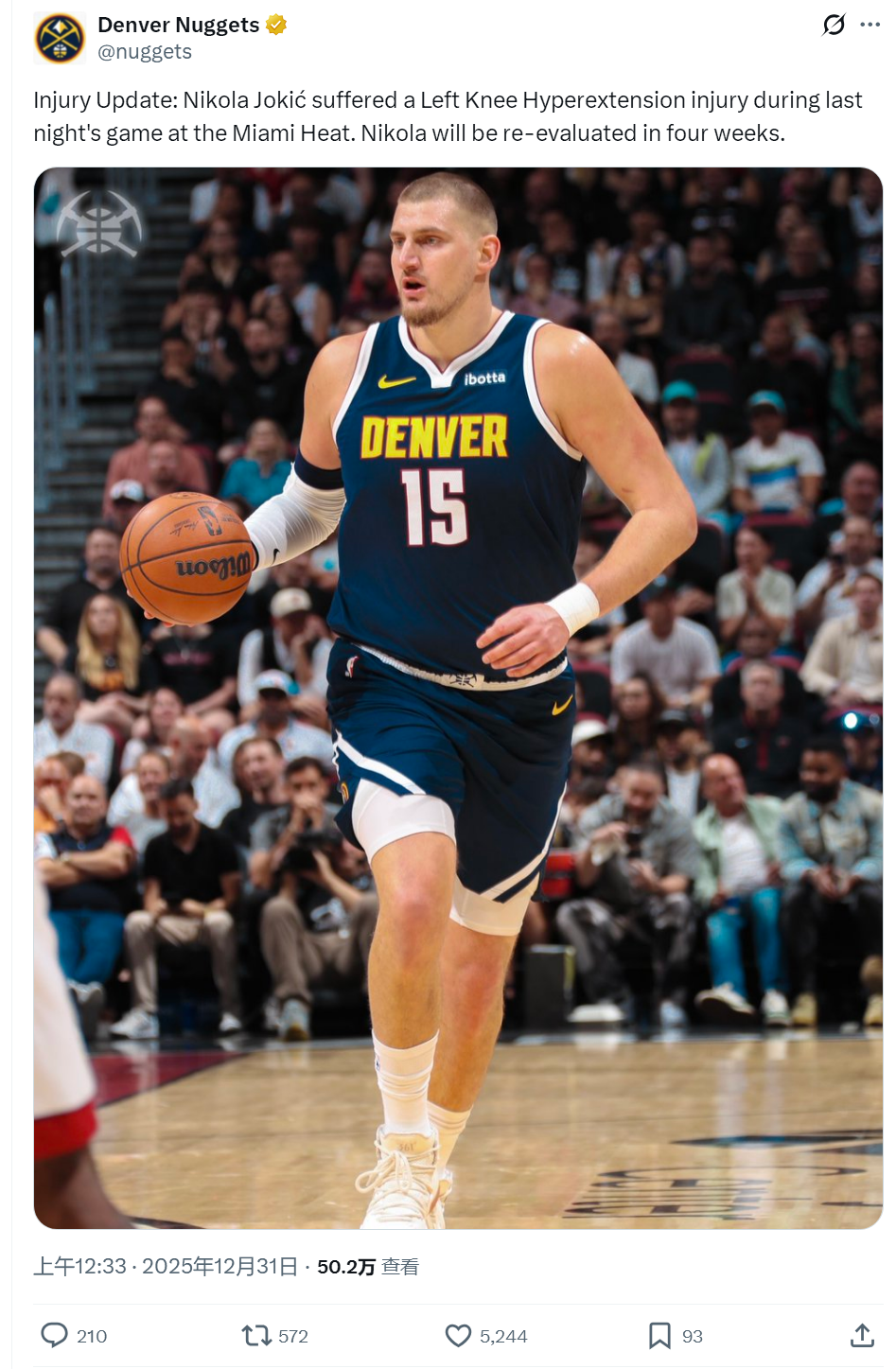 北京时间12月31日凌晨,掘金官方宣布:约基奇遭遇左膝过度伸展,将在4周后重新评估。不幸中的万幸,约基奇的十字韧带没有损伤。连续缺席一个月,将是约基奇NBA生涯休战最久的一次,此前他出战最少的一个赛季也有69场。