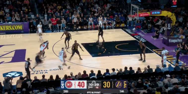 末节比赛开始,艾维三分命中,斯马特2罚全中,萨瑟三分命中,斯马特突破抛投。湖人连续出现失误,活塞打出一波12-2的进攻高潮,双方分差瞬间来到20分。海斯空接暴扣,坎宁安抛投打进2+1,活塞打出一波8-0的进攻高潮,进一步扩大领先优势。眼看双方分差越拉越大,湖人在比赛还剩下4分09秒换下全主力球员,宣告提前投降,比赛进入垃圾时间,最终湖人主场惨败活塞。