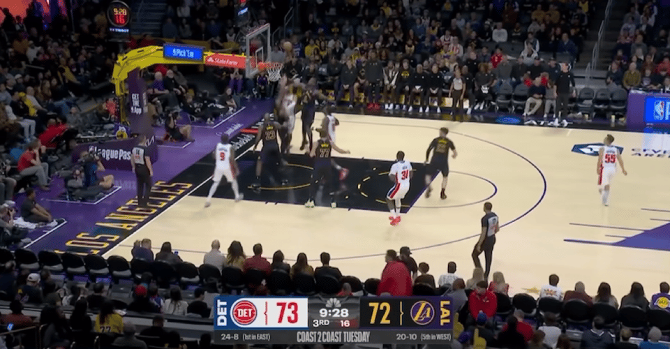 易边再战,艾顿空接暴扣,斯图尔特三分命中,东契奇和拉拉维亚连得5分,杜伦补扣得手。汤普森空切暴扣,詹姆斯上篮打进,杜伦后仰跳投,艾顿和东契奇连得5分,湖人扳平比分。坎宁安和霍兰连续突破得到6分,海斯上篮打进,东契奇和霍兰对飙三分,萨瑟2罚全中。艾维上篮打进,海斯补扣得分,艾维反手上篮。三节比赛结束,活塞96-88领先湖人。
