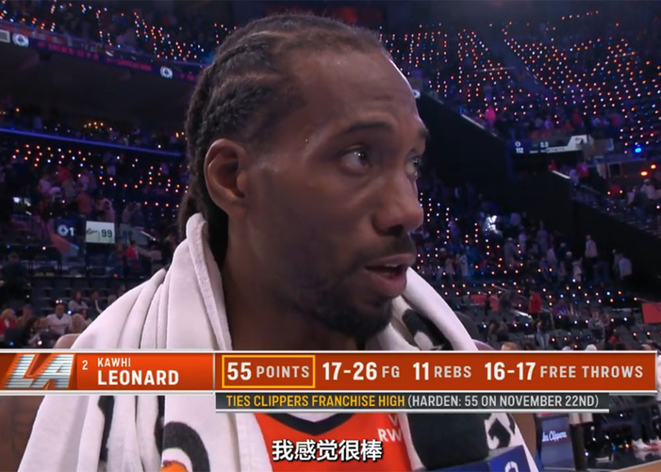 比赛结束后伦纳德接受了采访,首先谈到自己轰下了55分时,伦纳德说道:“就是第三节手感持续火热,泰伦-卢最终让我继续打,我想我当时可能不知道自己得了多少分,泰伦-卢看到我手热,就让我留在场上,然后投篮就不断命中。”这番话很好理解,泰伦卢坚持让伦纳德留在场上,是小卡爆发的重要原因。