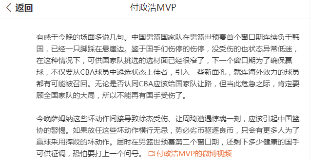 媒体人付政浩发文斥责广东男篮防守周琦使用武术动作。他表示,职业球员要恪守职业底线,不能砸别人饭碗。