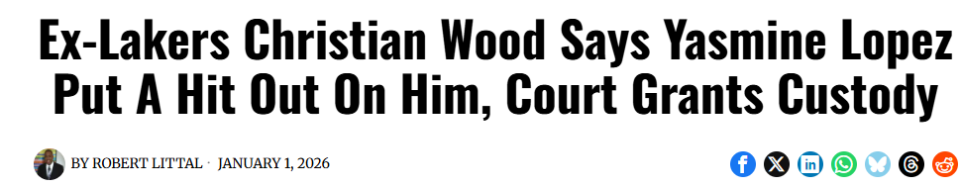 北京时间1月2日,据《美国周刊》获取的法庭文件显示,前洛杉矶湖人队前锋伍德指控其前女友亚斯明-洛佩兹涉嫌参与一起光天化日之下针对他的住宅抢劫谋杀未遂案。指控提出后,伍德获得了两人2岁儿子科比-肖恩-伍德的临时单独监护权。