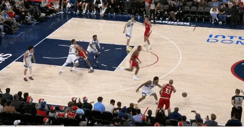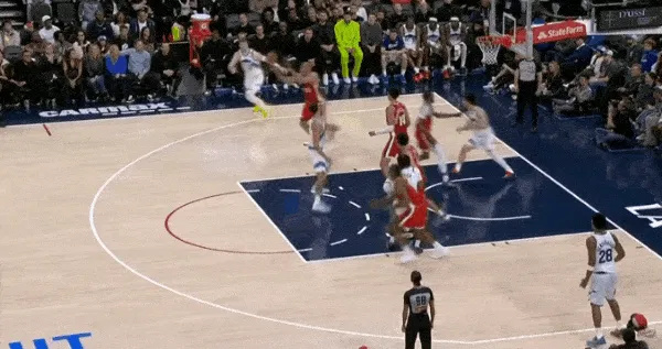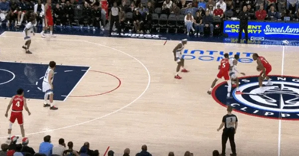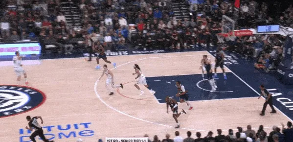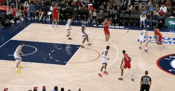 抓早期进攻,弧顶持球单打亨德里克斯:胯下攻击防守人前侧脚,随后再迅速衔接胯下配合后脚的“挖步”启动右路突破,行进间对抗接触的瞬间立即急停晃飞防守人,随即出手稍带后仰的中投。