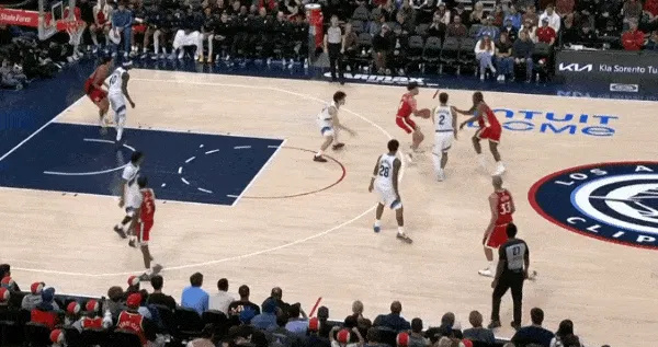 柯南上提拿球策应,伦纳德立即前往底角为巴图姆设置“下掩护”(Pin Down),巴图姆见克莱顿采取“倒扣防守”(Top-Lock)溜底线空切篮下反制,但没接到球。