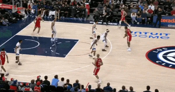 伦纳德见巴图姆掌握到球权,立即启动快攻奔向前场。接巴图姆上球前场1打0,单手举火烧天衔接双手倒C暴扣。