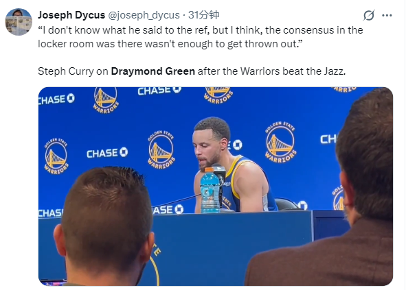谈到追梦被驱逐,库里赛后说道:我们赢了比赛,我们只关心这个。他也非常在乎这个,我知道他宁愿留在场上,我不知道他对裁判说了什么,但我们更衣室里的共识是,那并不足以导致他被驱逐出场。