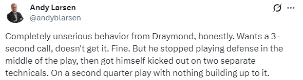 对于追梦被驱逐,爵士队记Andy Larsen表示:追梦的行为完全不负责任,老实说。他想要一个三秒违例的判罚,但没得到,没关系。但他在比赛中途就停止防守,然后因为两个技术犯规被直接罚出场。这是发生在第二节,之前完全没有任何铺垫的情况下。