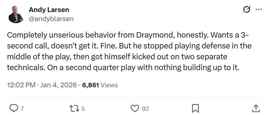 面对追梦这样的表现,爵士记者Andy Larsen公开发文批评道:“追梦的行为完全不负责任,实话实说,他想得到一个三秒违例的判罚,但没有得到,结果他就在比赛进行的情况下,直接放弃防守怒喷裁判,然后直接被罚出场,这一幕发生在第二节,还是在此前没有任何铺垫的情况下。”