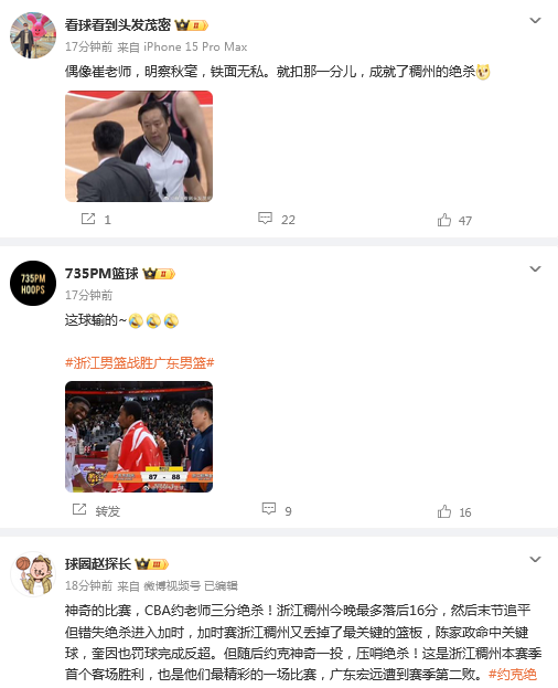 媒体人“看球看到头发茂密”发文点评:偶像崔老师,明察秋毫,铁面无私。就扣那一分儿,成就了稠州的绝杀。