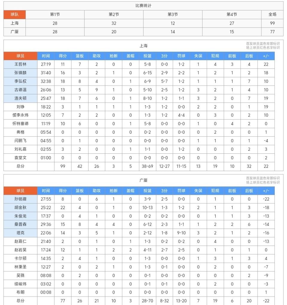 上海男篮99-77大胜广厦,终结对手8连胜,王哲林11+7,上海有实力争冠!