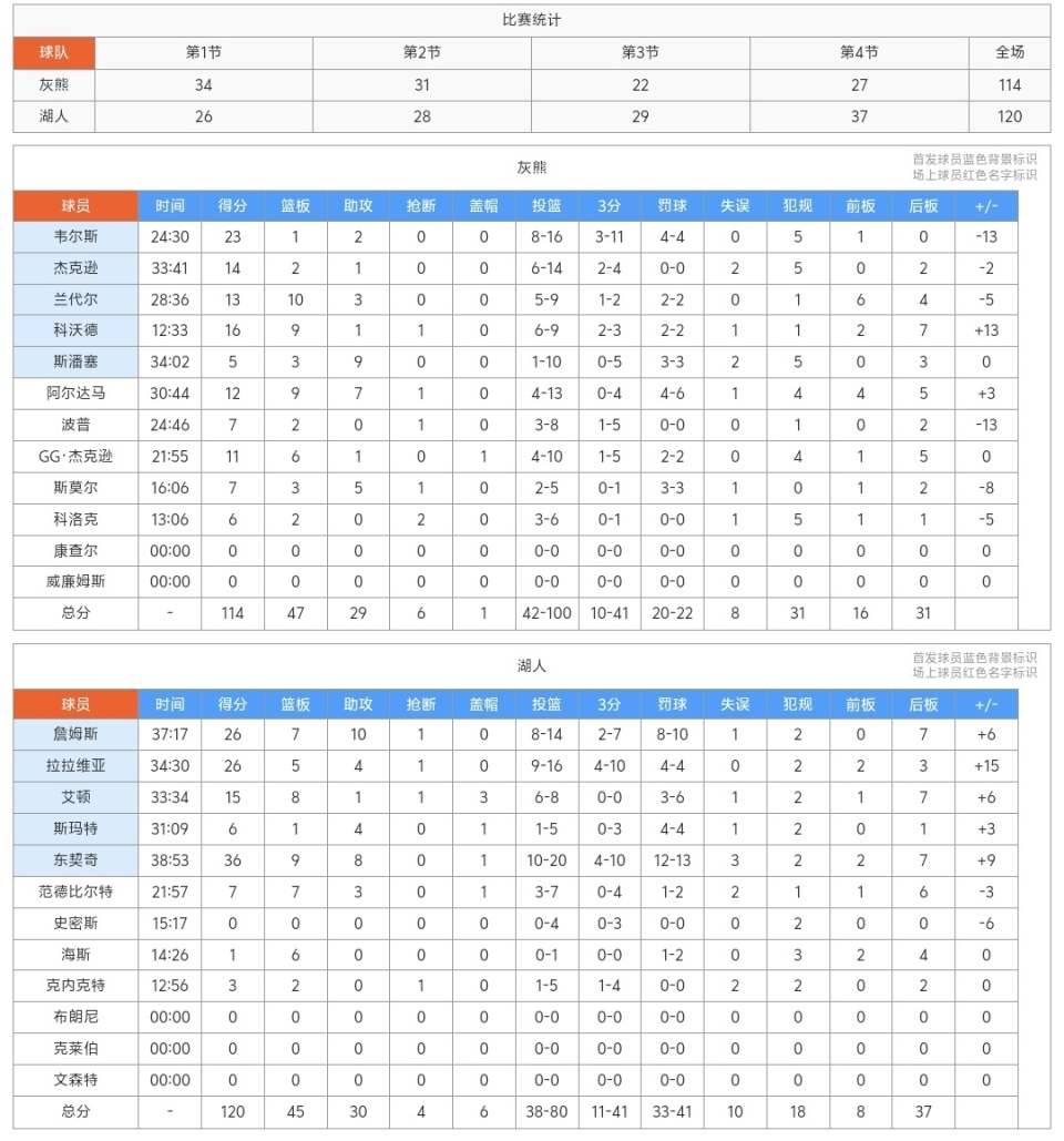 第二节两队开始了对拼火力,湖人本赛季的防守不太理想,他们更多的也是只能靠进攻,随着詹姆斯和拉拉维亚打出状态,湖人进攻有起色,但是灰熊多点开花让湖人防不胜防,中场休息时,湖人队54-65落后,没有了莫兰特,湖人反倒不知道重点防守谁了,今天的灰熊似乎更难对付!