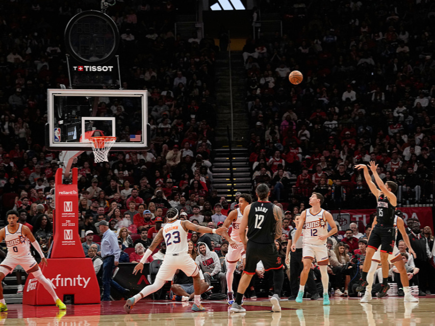 太阳队延续火热手感,半场结束时三分球21投10中,命中率47.6%。而火箭队三分球21投仅5中,命中率只有23.8%。