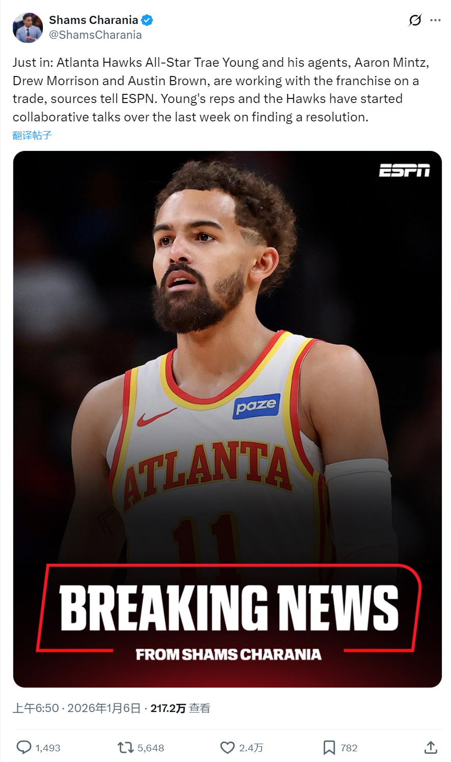 北京时间1月6日上午,NBA名记Shams报道,特雷-杨已经提出交易申请,他和经纪团队正与老鹰管理层商讨交易事宜。Shams表示,自老鹰拒绝4年2.29亿续约特雷-杨之后,他的经纪团队一直跟管理层沟通,从上周开始讨论交易。