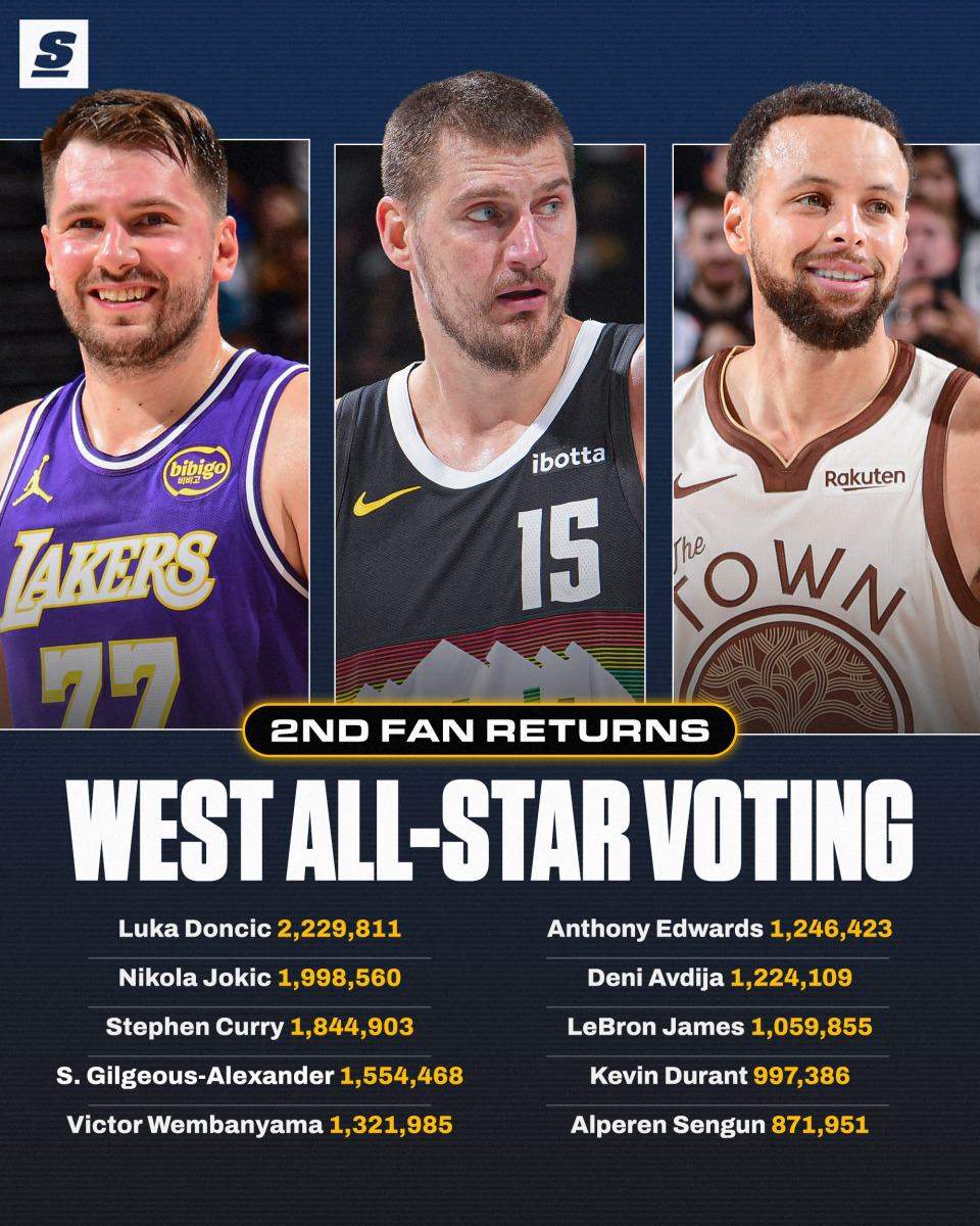 西部:1、东契奇2229811票;2、约基奇1998560票;3、库里1844903票;4、亚历山大1554468票;5、文班亚马1321985票;6、爱德华兹1246423票;7、阿夫迪亚1224109票;8、詹姆斯1059855票;9、杜兰特997386票;10、申京871952票