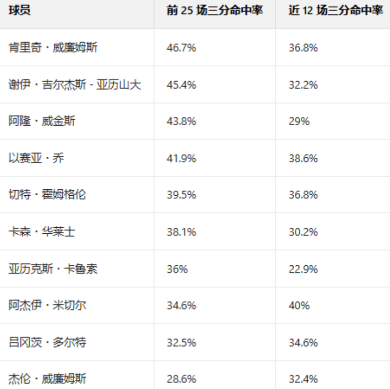 亚历山大的三分投射表现断崖式下滑,而他本赛季的场均三分出手数位列球队第三(4.9次),这一问题尤为突出。此外,全队的三分投射都出现了不同程度的滑坡。