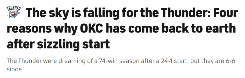北京时间1月7日,雷霆队曾以24胜1负的梦幻开局,憧憬着冲击昔日勇士73胜的赛季神迹,然而此后他们却仅取得6胜6负的战绩,光环褪去,回归凡尘。