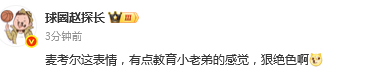 媒体人赵探长发文点评:“麦考尔这表情,有点教育小老弟的感觉,狠绝色啊”。