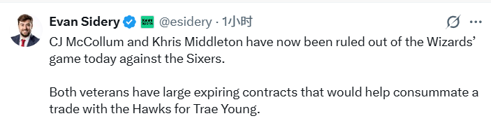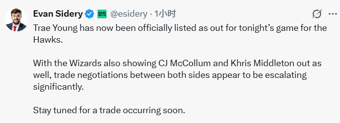Sidery还表示,一笔交易或将很快达成。奇才的两位老将均持有大额到期合同,这将有助于促成奇才与老鹰关于特雷-杨的交易谈判,使薪资匹配更具可行性。