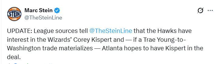 此前,Shams报道,特雷-杨的经纪人团队仍在与老鹰管理层持续沟通,致力于达成特雷-杨离队的交易方案。消息源同时指出,老鹰队也在多条交易线索上积极推进谈判。名记Stein报道,老鹰对奇才的基斯珀特感兴趣,希望将他加入到杨的交易中,赛前,基斯珀特也确定因伤病管理缺阵。