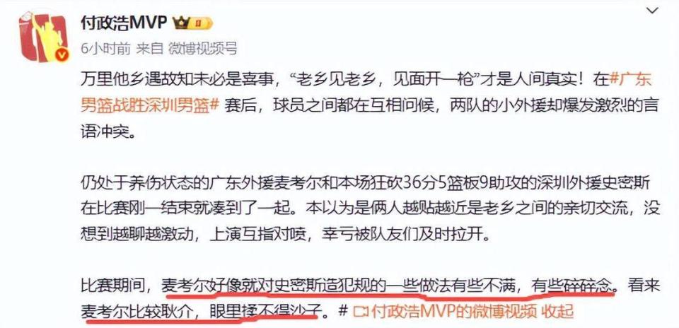 那么,是什么原因引起麦考尔与史密斯斗嘴的呢?媒体人付政浩道出了原因。那就是比赛期间,麦考尔对史密斯造犯规的一些做法有些不满,有些碎碎念。看来麦考尔比较耿直,眼里容不得沙子。