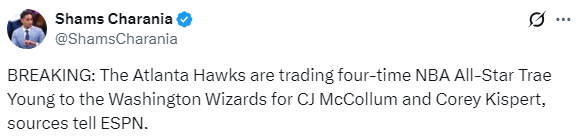 北京时间1月8日,NBA大交易来了,据ESPN名记Shams Charania报道,亚特兰大老鹰队将四次入选NBA全明星的特雷-杨交易至华盛顿奇才队,换来CJ-麦科勒姆和科里-基斯珀特。