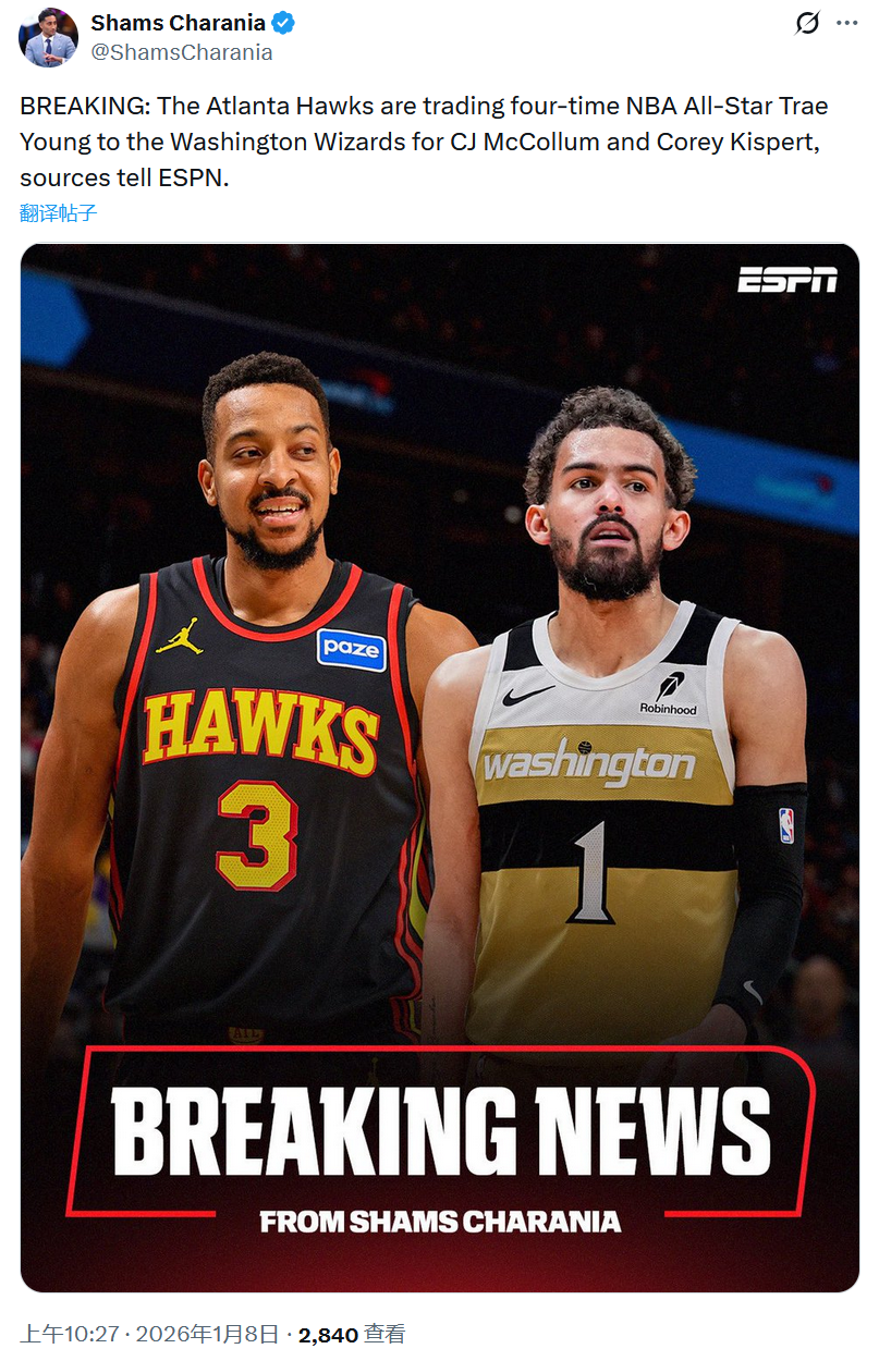 老鹰奇才一换二交易达成!特雷杨前往华盛顿 CJ和基斯珀特远赴亚特兰大