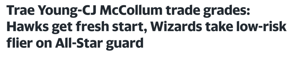 特雷-杨1换2交易评级:老鹰评B奇才B+ 华盛顿更被看好成为赢家