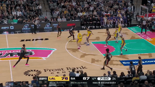 易边再战,福克斯连得6分带队扩大领先, 东契奇两罚全中以及轰进三分,范德比尔特连得4分帮助湖人追到2分,随后马刺8-3扩大优势,艾顿中投命中,卡斯尔对抗得分,凯尔登抛投以及顶着防守轰进压哨三分,此时马刺领先到12分;海斯抛投得分,凯尔登造犯规罚球得分,东契奇打板得分,科内特空切抛投,马刺一直占上风,尚帕尼补扣,三节战罢,马刺79-68领先湖人11分。