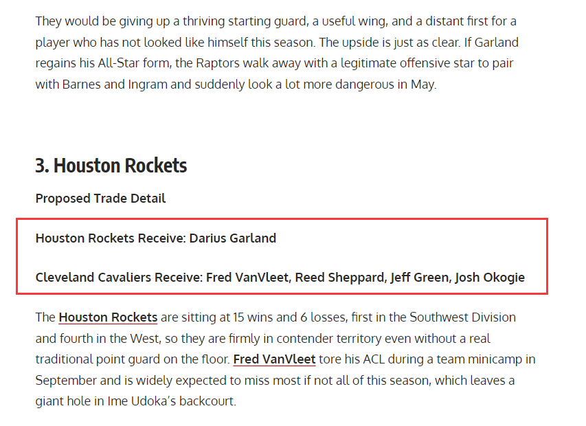 美媒:打包范乔丹谢泼德换加兰,提供4换1方案,火箭得全明星控卫