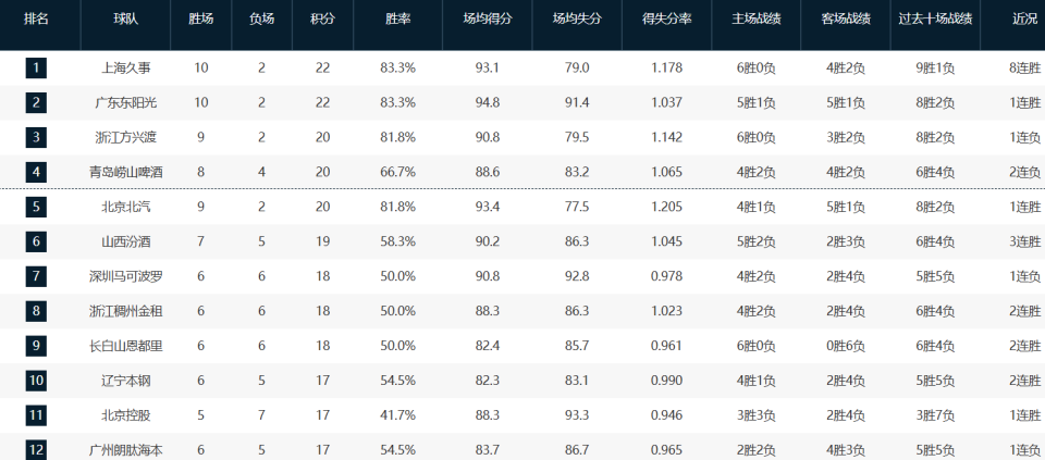 北京队目前以9胜2负排名联盟第五,场均得分93.4第三,失分77.5第一,篮板40.4第四,百回合得分128.6第一,百回合失分106.8第三,百回合净胜分21.8第一,有效命中率57.1%第一等等。