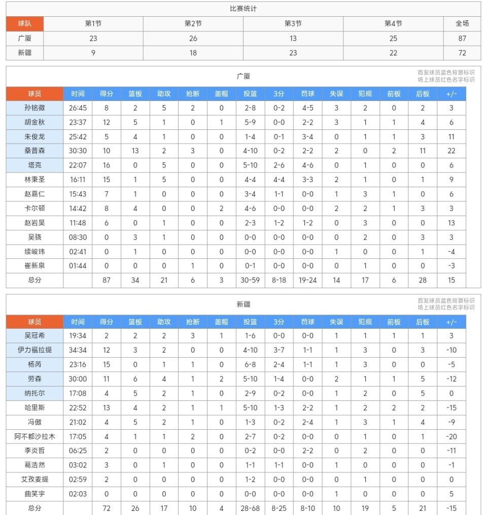 下半场第三节易边再战,广厦队突然哑火了,孙铭徽的手感不太理想,胡金秋出手不多,外援也陷入了僵局,新疆队伊利福拉提和杨芮等人趁机打出了进攻高潮,不过三节战罢,新疆依然50-62落后!末节单外援的比拼,广厦本土球员开始发力,而新疆队没有追分的能力,最终广厦拿下了比赛!