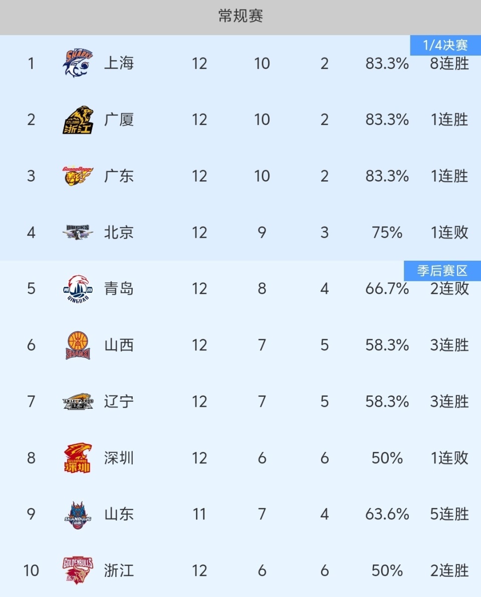 北京时间1月9日,CBA常规赛,浙江广厦主场击败了新疆男篮,目前广厦10胜2负,超越广东,排名联赛第2,不过CBA前3的球队战绩依然没有拉开,大家的胜负场都一样,本赛季群雄割据的局面确实比较精彩刺激啊!另外一场比赛北京爆冷输球,目前北京排名第4!