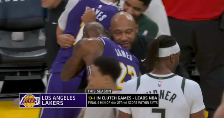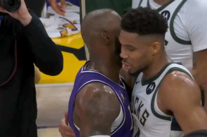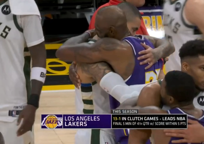 最后16秒小波特三罚两中,詹姆斯保护篮板,可湖人最后一攻,雷迪克不喊暂停,示意继续打,最终詹姆斯运球被字母哥抢断,范德比尔特只能采用犯规战术,波特两罚全中彻底杀死比赛,最后0.6秒喊暂停已经太晚,最终湖人4分惜败。赛后,詹姆斯与字母哥拥抱交流很久,之后与特纳、库兹马以及雄鹿助教哈姆(前湖人主帅)拥抱致意。