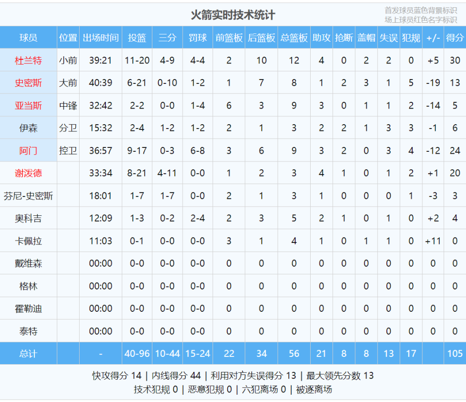 “战犯”小史密斯同样打了40分钟,21中6,其中三分10中0,罚球2中1,得到13分8板1助,正负值-19;