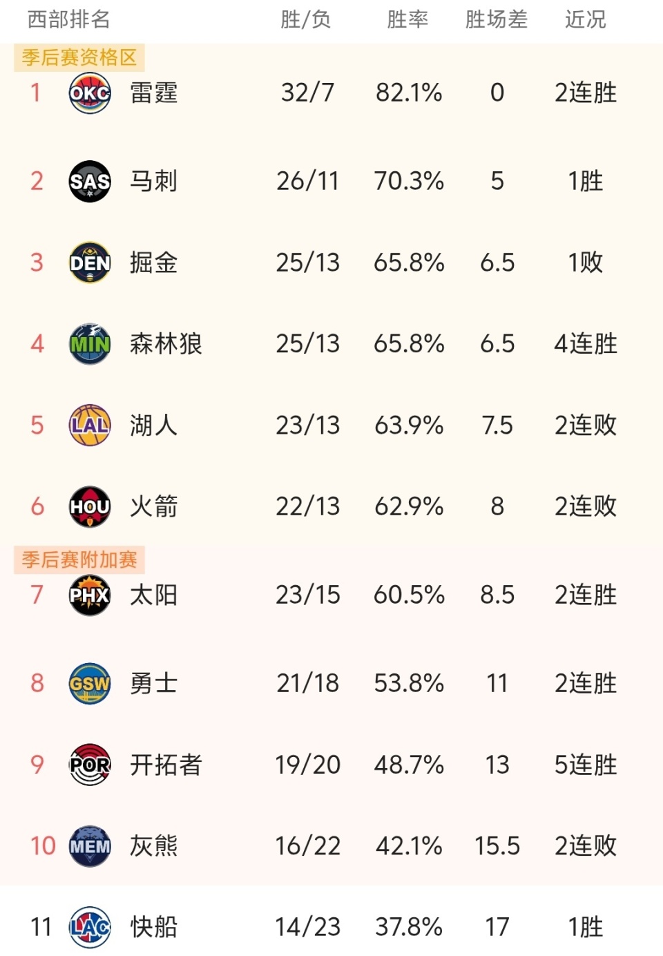 随着火箭105-111连败,湖人掘金输球,NBA最新积分榜出炉:火箭第6难保!