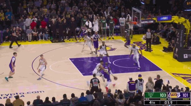 最后3.3秒,字母哥伸手拦截,合法触球将球从詹姆斯手中拨走,这一球也没有犯规。