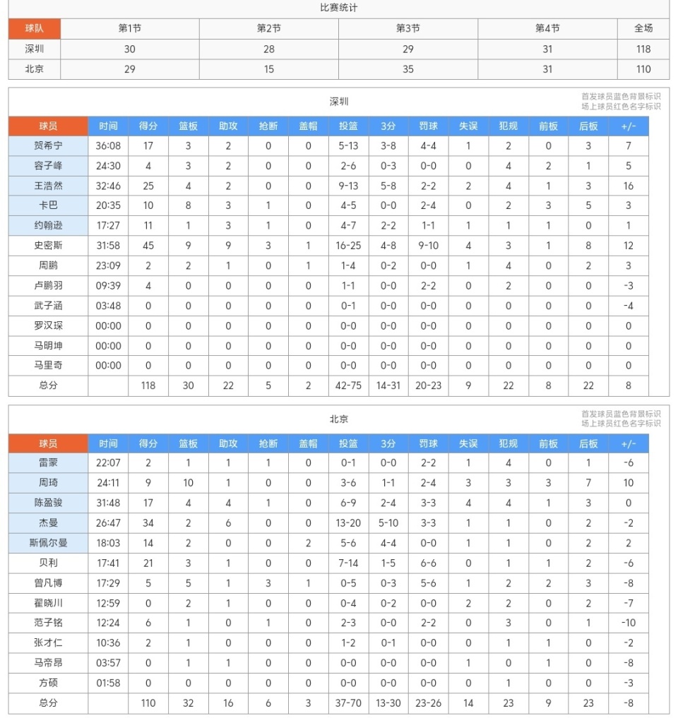 北京男篮爆冷110-118不敌深圳,周琦9分,谁是输球罪魁?数据一目了然!
