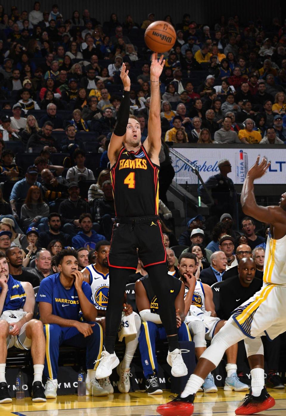 末节决战,奥孔古和肯纳德三分再中,库里打成2+1,肯纳德和奥孔古再次连续命中三分拉开到25分领先。追梦上篮得手,梅尔顿连续得分。基斯波特两罚全中,沃克投篮得手。随后勇士队打出进攻高潮,巴特勒和库里各得5分打出10-0缩小到15分!奥孔古和佩顿先后得手,巴特勒打成2+1后,麦科勒姆同样打成2+1,勇士队换下主力宣告投降,老鹰队客场取得胜利。