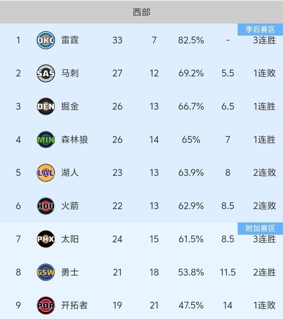 随着掘金108-104险胜雄鹿,森林狼绝杀马刺,NBA最新积分榜出炉!
