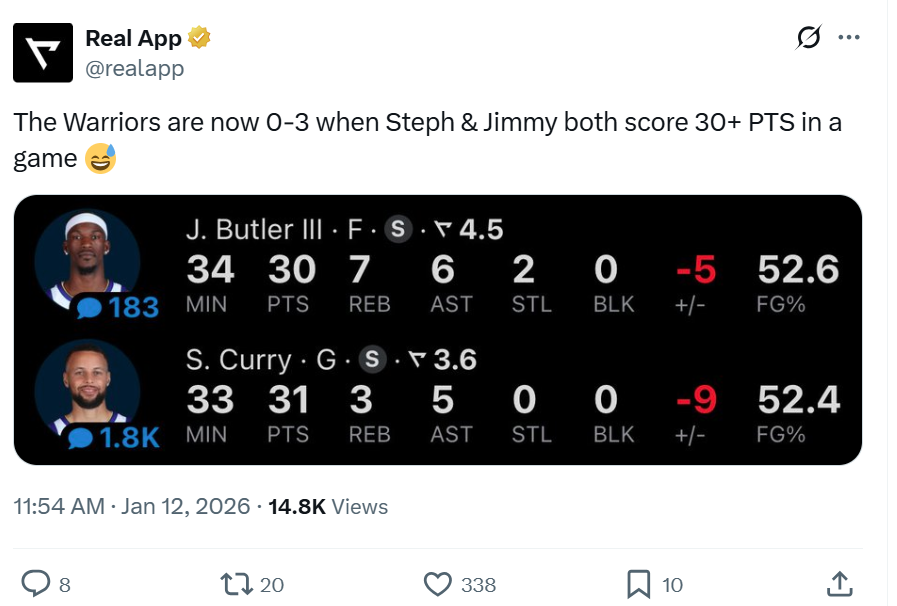 这并不是偶然现象,本赛季巴特勒与库里均交出30+的三场比赛,勇士队3战皆败。