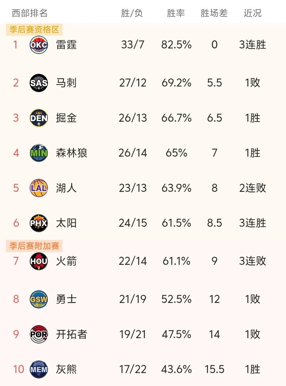 随着火箭98-111连败、被太阳超越,NBA最新积分榜出炉:火箭第7!