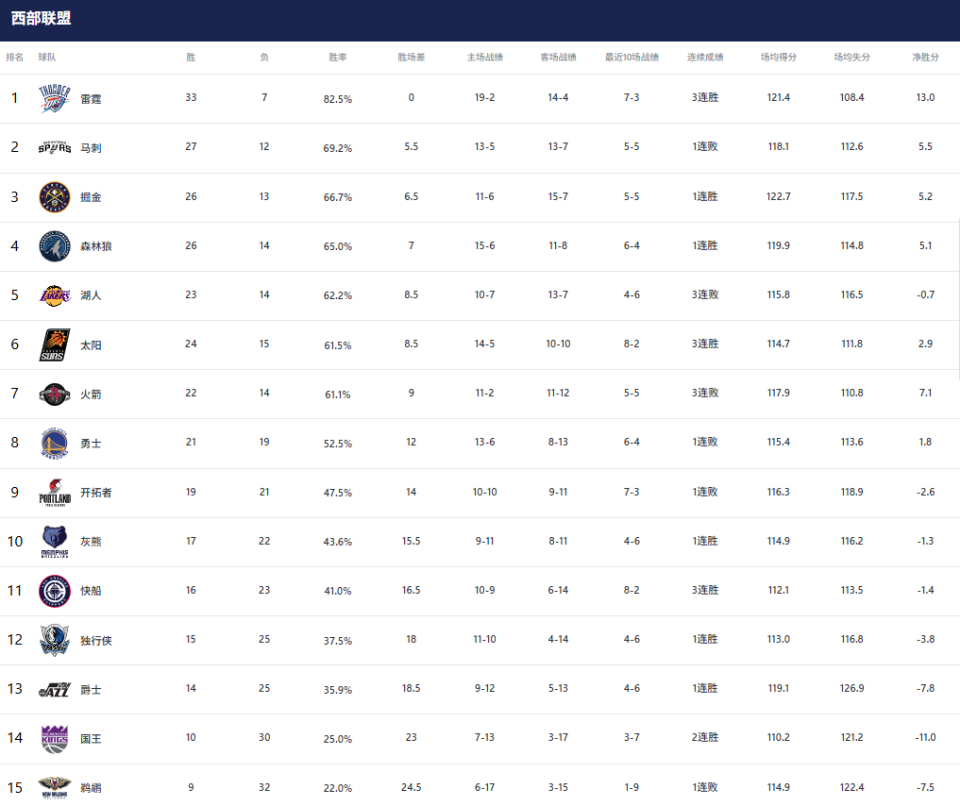 1-3名:雷霆(33胜7负)、马刺(27胜12负)、掘金(26胜13负)