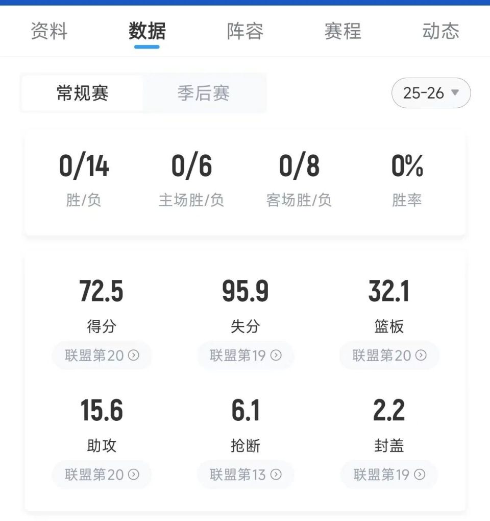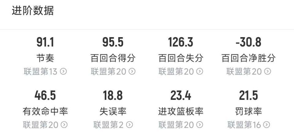更糟糕的是,他们进攻差就算了,就连防守也是一塌糊涂,全队场均只有2.2次盖帽,每场比赛丢失95.9分,百回合失分126.3分,百回合净胜分是负30.8,除此之外,全队场均助攻数、有效命中率、投篮命中数、进攻篮板数、后场篮板数等多项数据也都是全联盟倒数第一。