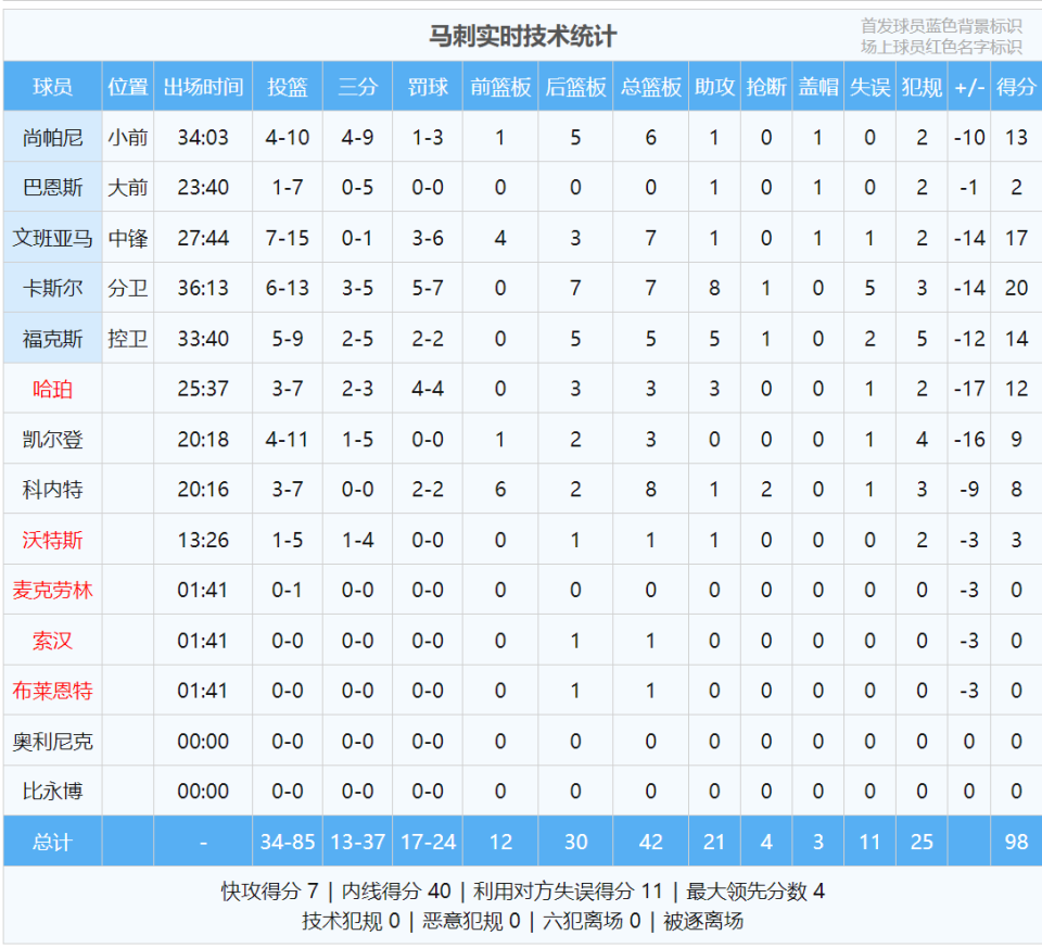 马刺这边,卡斯尔20分7板8助5失误、文班亚马17分7板1助、福克斯14分5板5助1帽。哈珀高开低走,首节3中2,之后三节4中1。此役过后,马刺27胜13负仍排西部第二,但胜场数已被掘金追平,仅领先第四的森林狼0.5个胜场。
