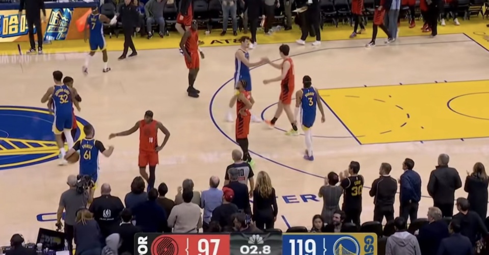 最后21.1秒!开拓者落后22分,双方不打了,勇士球员主动上前问候杨瀚森!