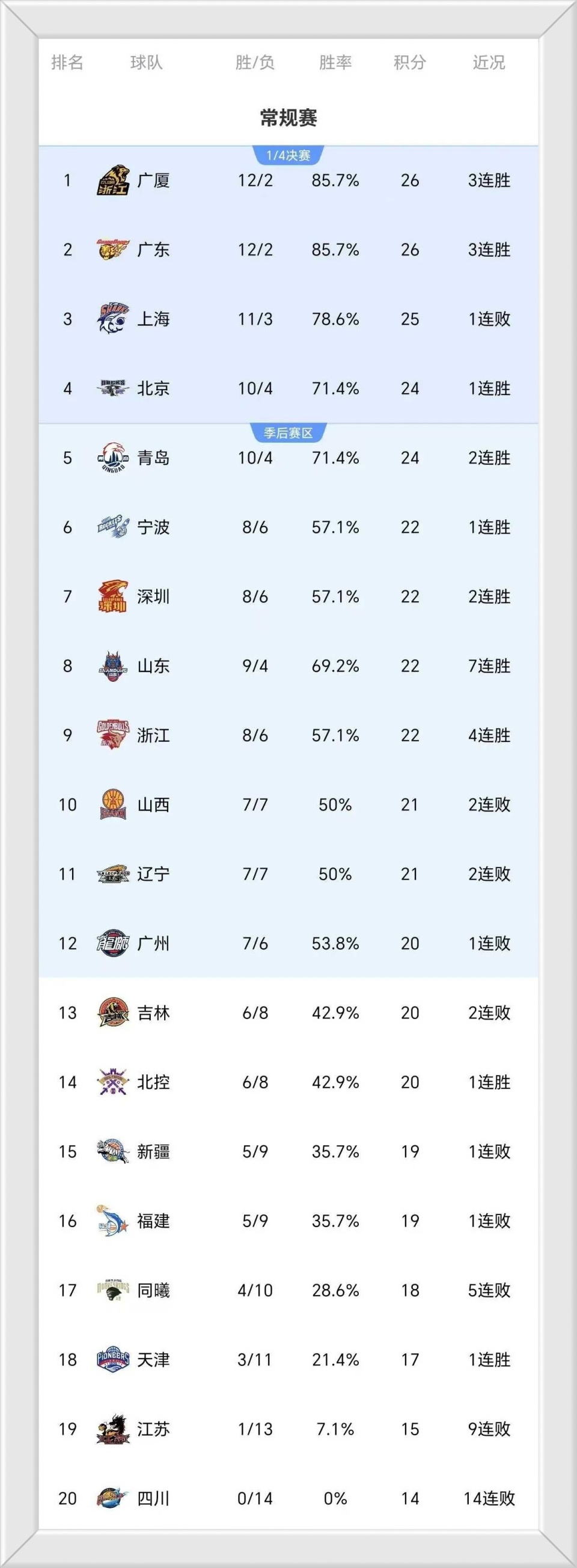 ②、广厦3连胜重登排名第一宝座,广东以相同的战绩位居次席;