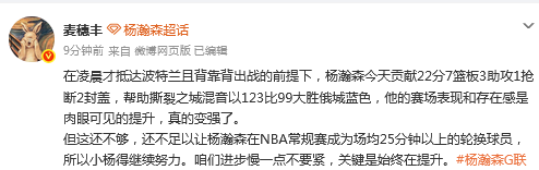 但这还不够,还不足以让杨瀚森在NBA常规赛成为场均25分钟以上的轮换球员,所以小杨得继续努力。咱们进步慢一点不要紧,关键是始终在提升。