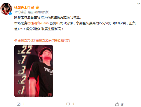 媒体人“麦穗丰”发文点评:在凌晨才抵达波特兰且背靠背出战的前提下,杨瀚森今天贡献22分7篮板3助攻1抢断2封盖,帮助撕裂之城混音以123比99大胜俄城蓝色,他的赛场表现和存在感是肉眼可见的提升,真的变强了。