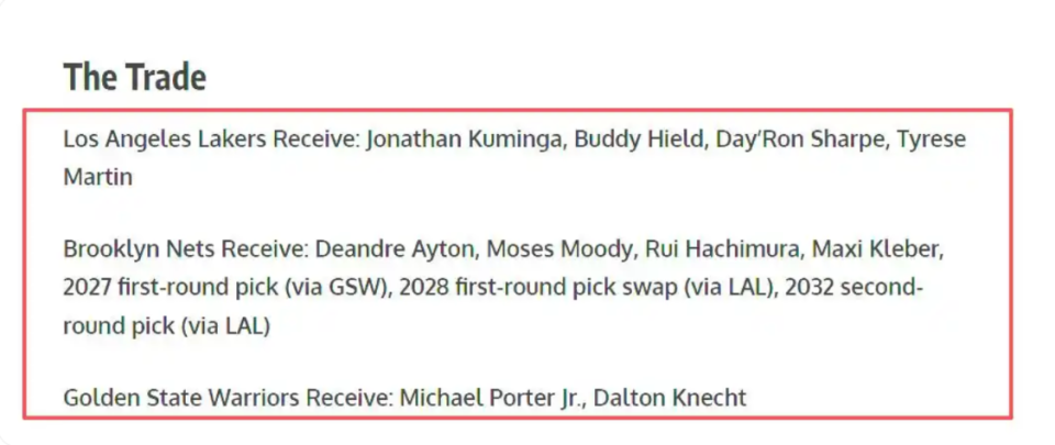 篮网则送出小波特和克内希特,换来艾顿、穆迪、八村塁、克莱伯,以及未来多个选秀权相关资产。