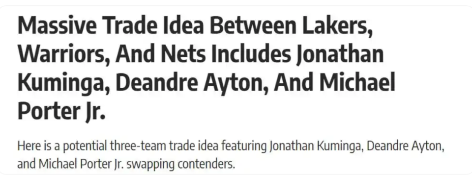 据多家美媒梳理,目前讨论度最高的一套方案中,湖人希望得到库明加,勇士把目标锁定在小迈克尔·波特身上,而篮网则愿意接手合同、吃下球员,换取选秀权和可流动资产。